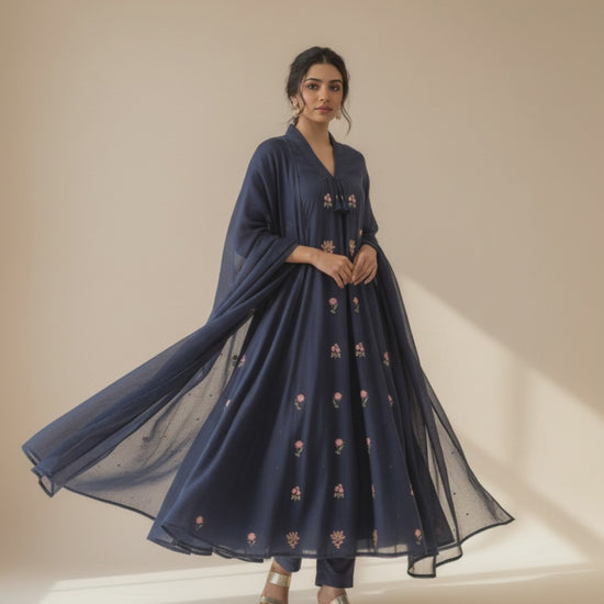 Blue Premium Dhabu Cotton Kurti Set with Applique Work & Cotton Dupatta