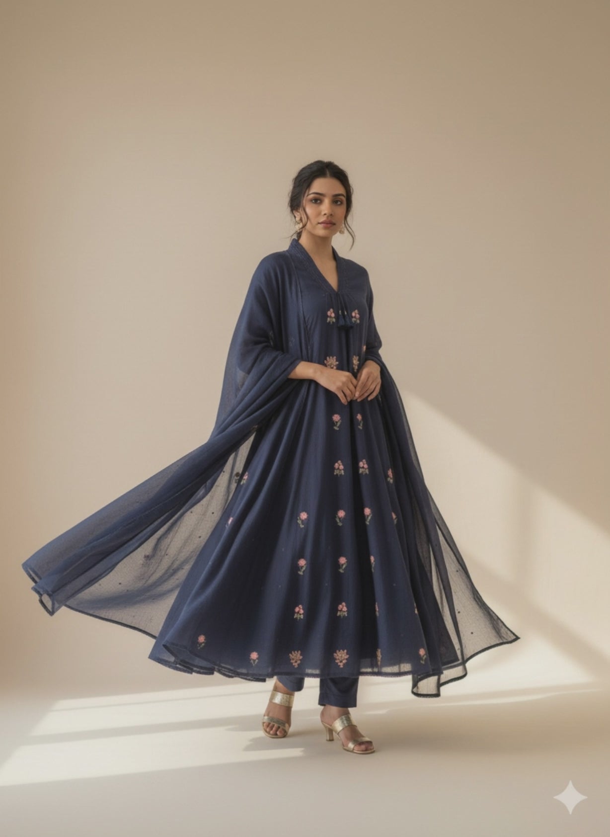 Jaipuri Trendz New Style Cotton Kurti pant and dupatta set Embroidery Work (BLUE)